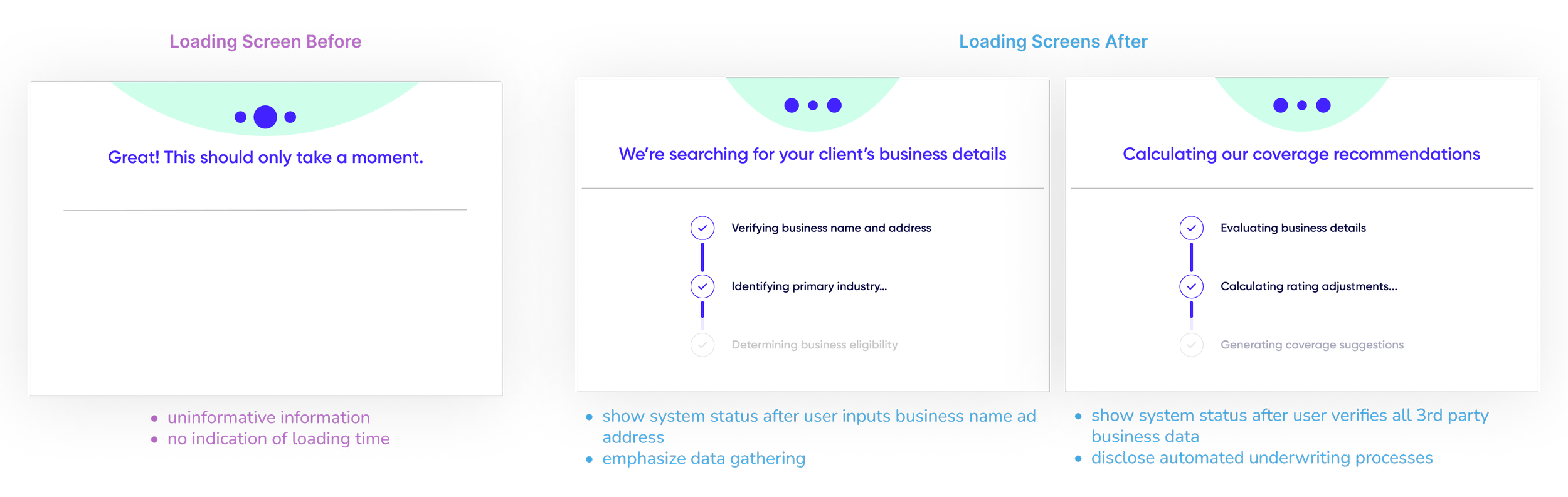 I also used existing loading screens to provide progress descriptions. We used these opportunities to explain what automated underwriting endpoints are called that replicate a typical underwriter’s process to follow the usability heuristic of showing system status.