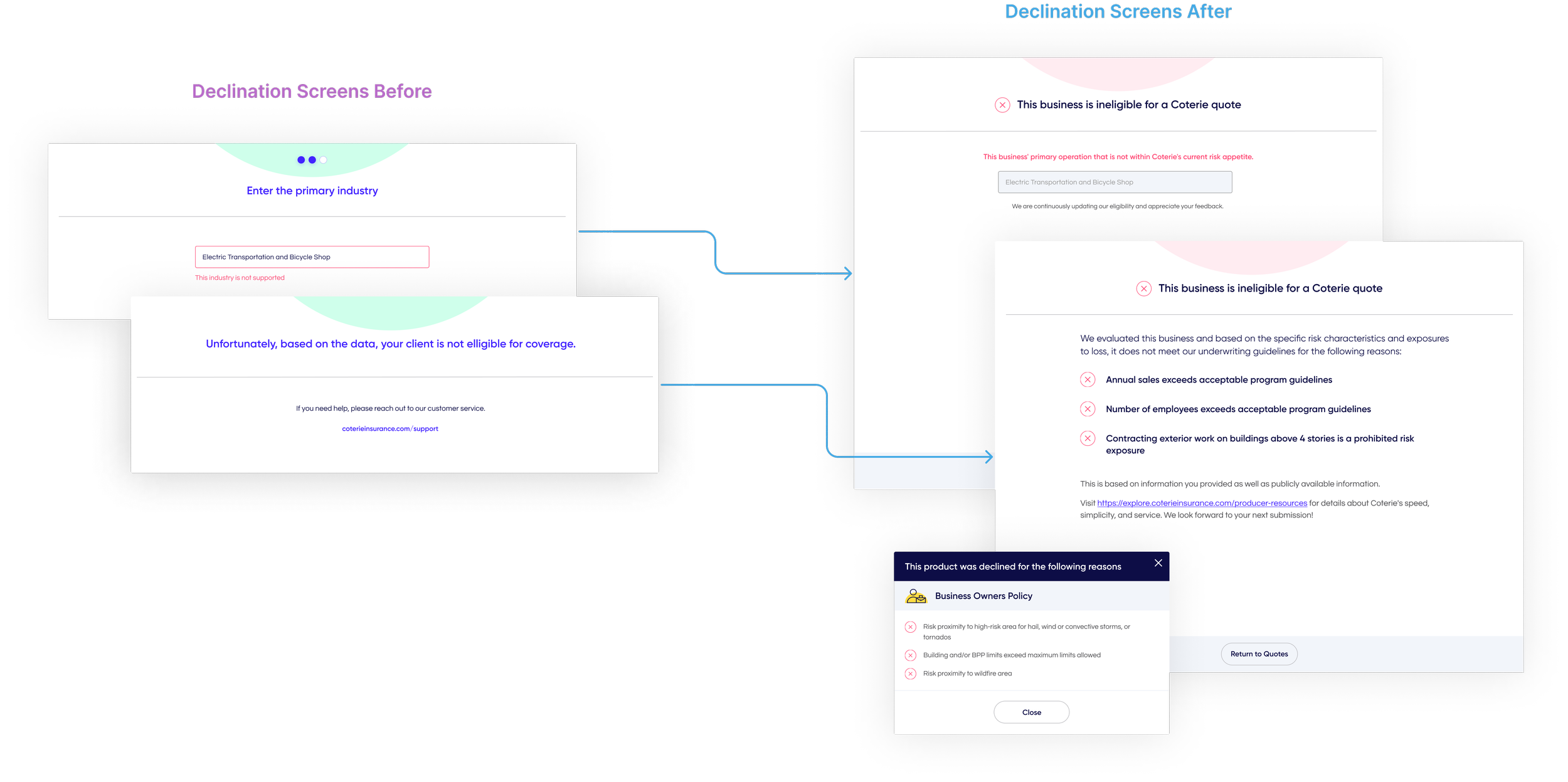 Allow a user to receive a declination earlier in the process. After entering any industry that Coterie does not accept, I introduced an additional screen where the user would see the early declination. Rather than having adding additional information that would not affect eligibility, I refined the flow where something as binary as a “yes” or “no” on the industry of business could trigger that early declination.