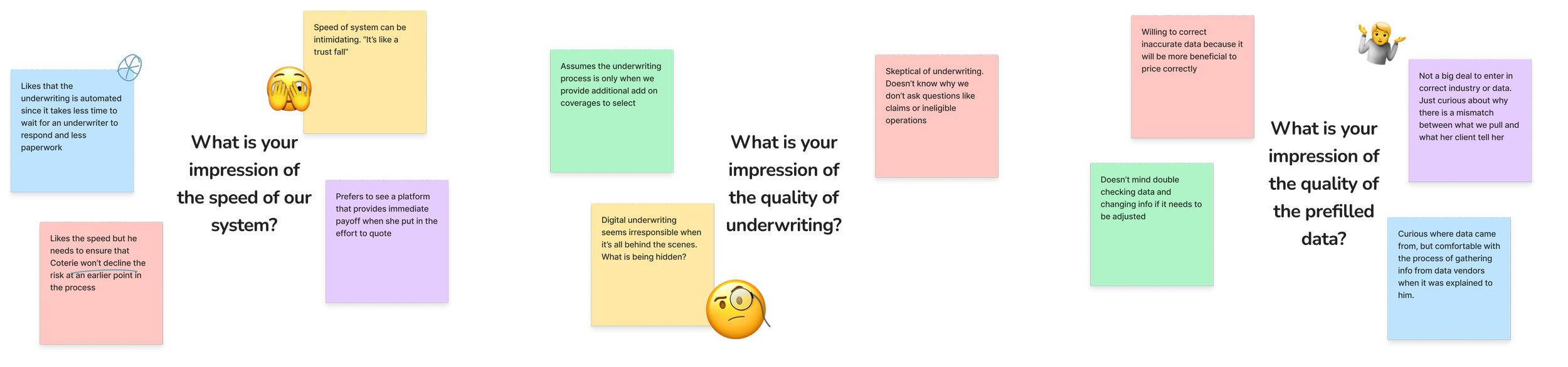 I decided to interview 5 insurance agents with a range of industry experience. It was important to validate our internal feedback against what our actual end users would experience. Via contextual inquiry sessions, my goal was to find out what points in the flow might be negatively received and dig into the reasoning behind those negative reactions.